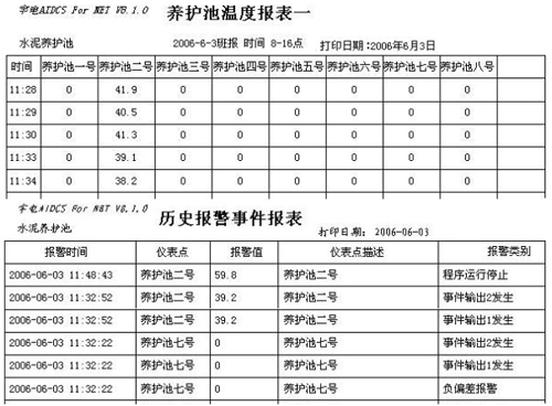 7.可隨時打印實時8個數(shù)據(jù)曲線圖表、8個歷史數(shù)據(jù)曲線顯示圖表及每5秒數(shù)據(jù)表和班報、日報、報警報表。