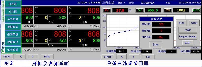 1、數(shù)據(jù)采集及控制:軟件系統(tǒng)從工業(yè)現(xiàn)場溫度控制器采集測量值,編輯實(shí)時曲線,可同時顯示8條實(shí)時曲線,用顏色來區(qū)別。曲線顯示可選百分比與實(shí)時曲線2種圖。也可屏蔽其他曲線,顯示單條曲線。呈現(xiàn)的實(shí)時數(shù)據(jù),并存入系統(tǒng)內(nèi)數(shù)據(jù)庫,以便日后數(shù)據(jù)查詢等使用。在流程圖、實(shí)時趨勢圖或儀表畫面上: